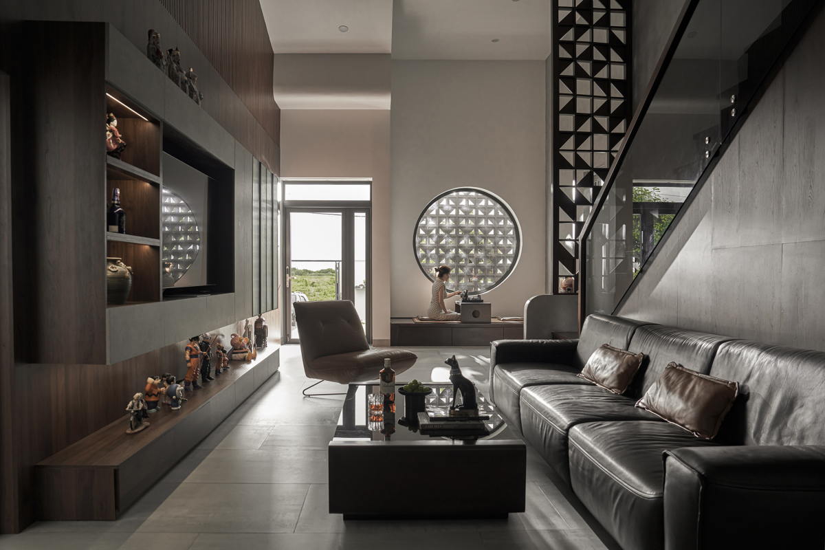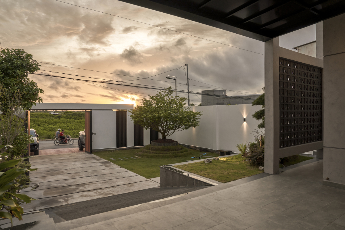 Phần nội - ngoại thất được lấy cảm hứng từ triết lý thiền kết hợp wabi-sabi, chú trọng vào giải pháp lấy sáng và yếu tố tự nhiên. Trong đó, ngoại thất nổi bật với lớp bề mặt thô mộc từ những viên đá cuội và gạch bông gió, tạo vẻ đẹp gần gũi, hòa hợp với môi trường xung quanh.