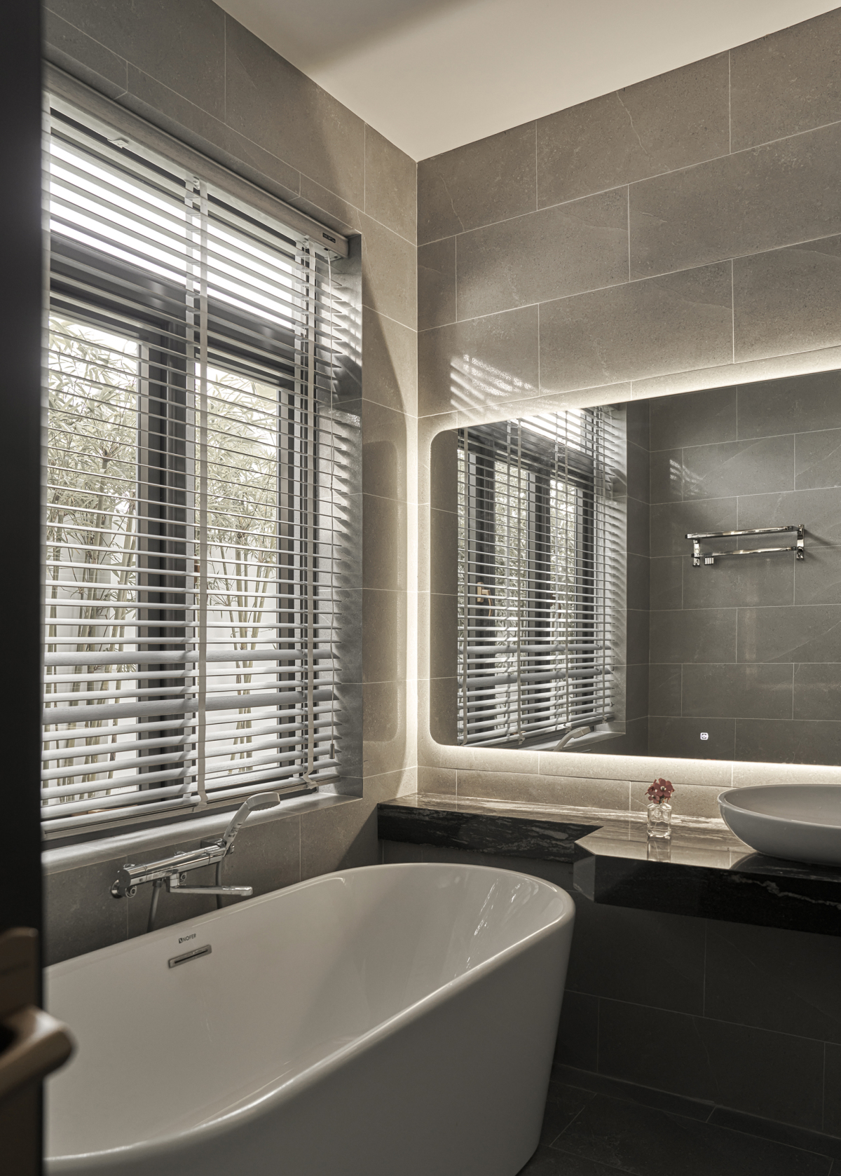 Phòng tắm luôn thông thoáng nhờ cửa sổ lớn nhìn thẳng ra mảng xanh bên hông công trình.