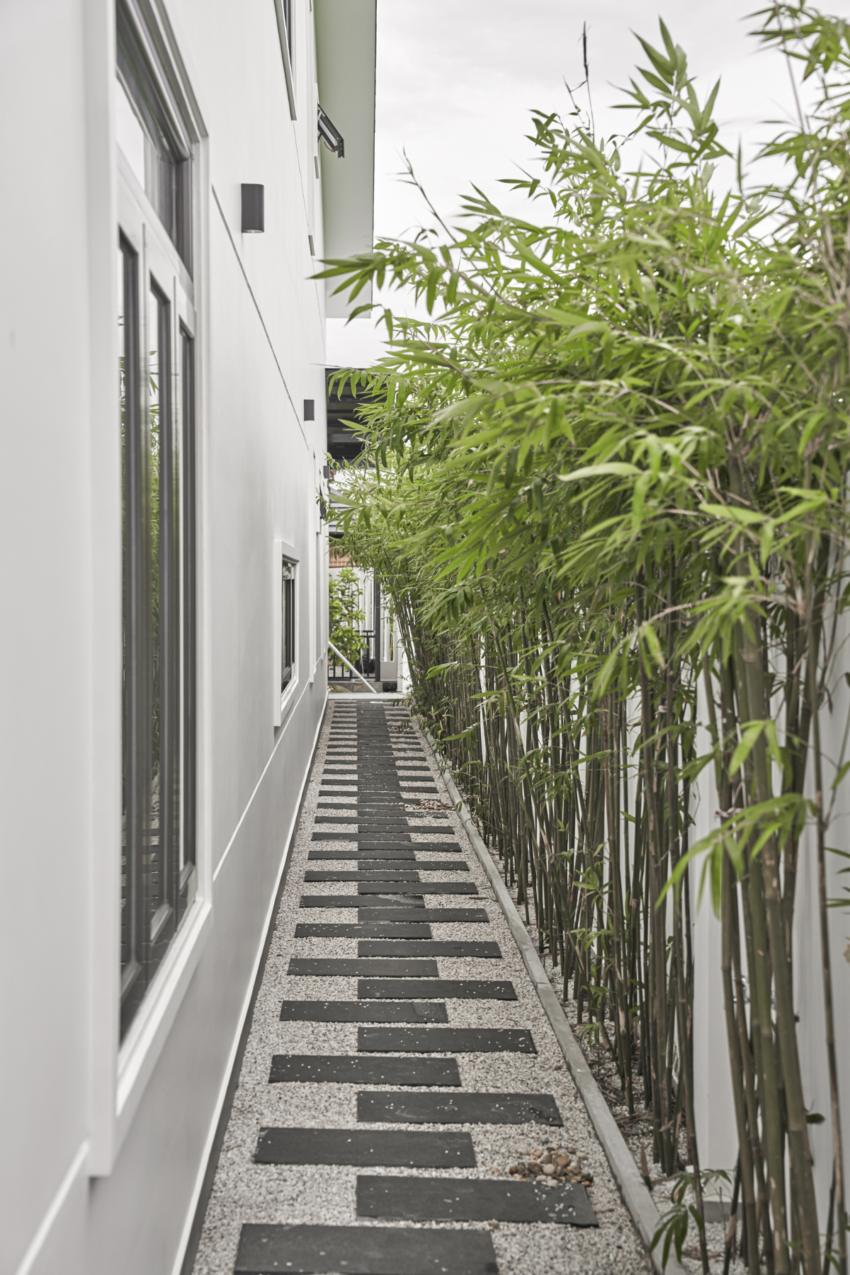 Khối nhà chính được xây lùi vào trong, chừa lại phần sân trước rộng rãi làm vườn cây và chỗ để xe.